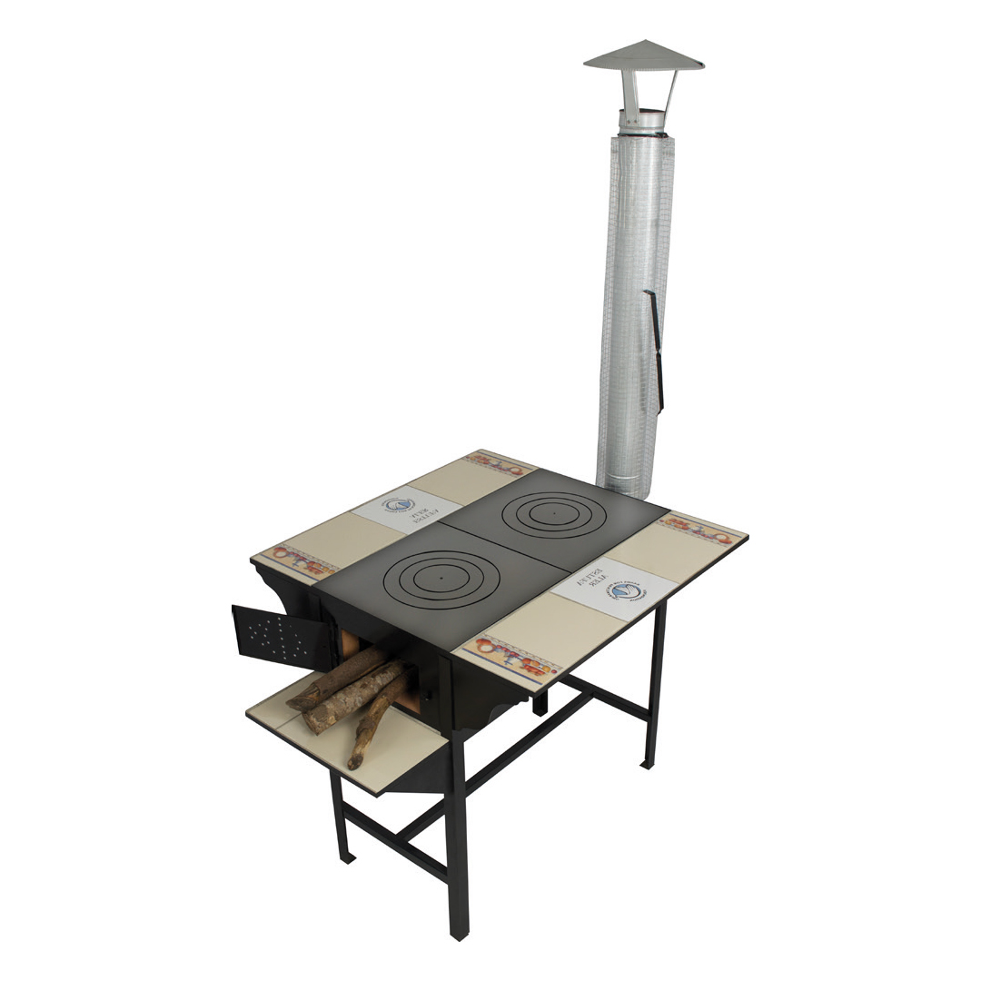 Estufa móvil de dos hornillas con estructura metálica y cámara de combustión robusta fabricada con ladrillo tayuyo (barro).